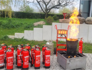 Wir stellen Ihnen unseren Löschtrainer mit Übungsfeuerlöschern und weiterem Zubehör zur Verfügung.